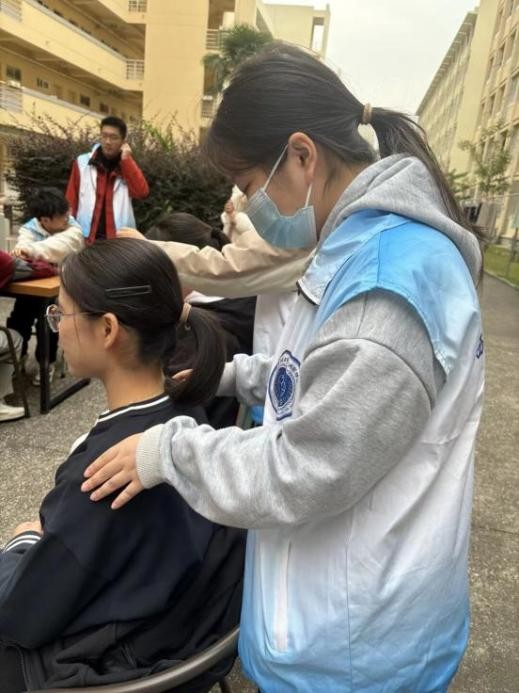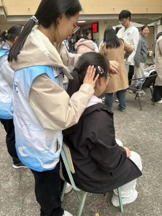 推拿体验区,志愿者们娴熟演示推拿手法,细致讲解原理与适应症,为肩颈不适的师生提供专业舒缓服务,让大家直观感受中医理疗的独特疗效。