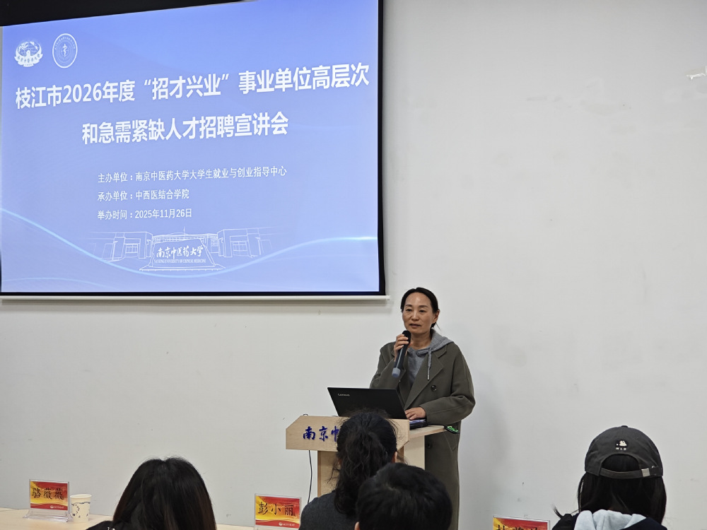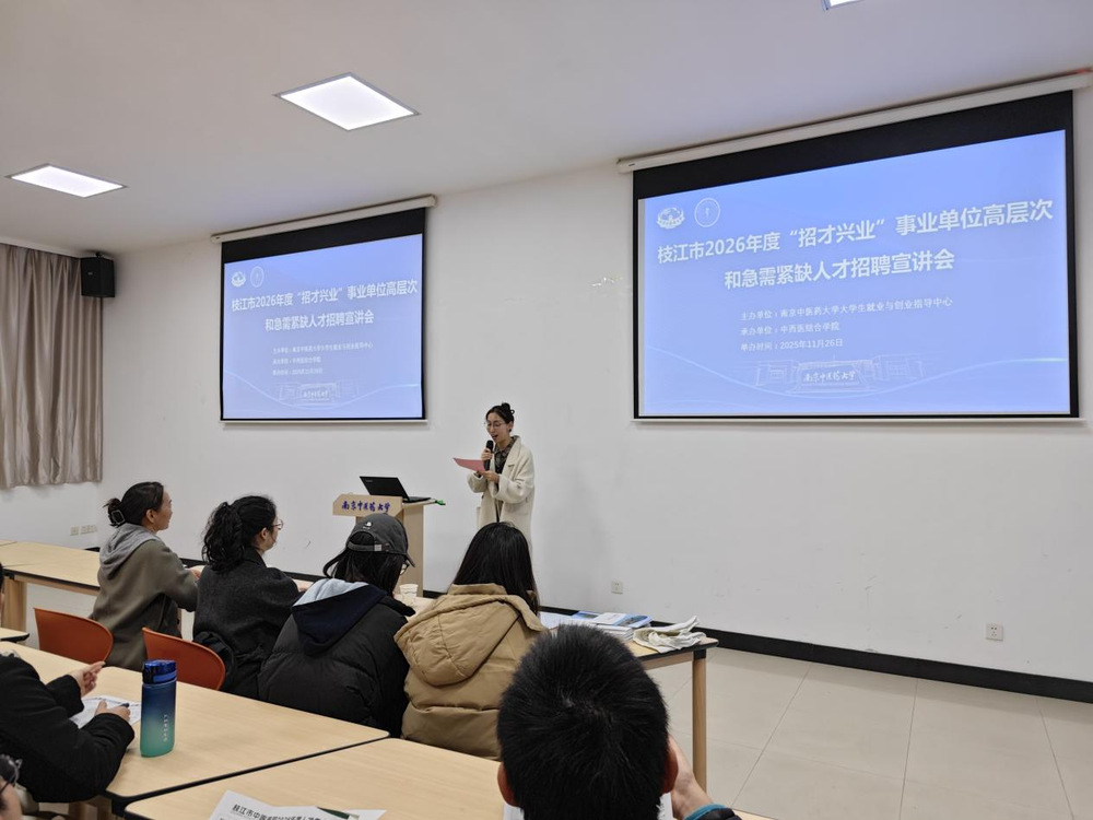 2025年11月26日,中西医结合学院联合湖北枝江市卫生健康局,于远志园“一站式”学生社区举办枝江市2026年度“招才兴业”事业单位高层次和急需紧缺人才招聘宣讲会。枝江市人民医院、枝江市中医医院携大批优质岗位来到现场,我校50余名研究生参与了宣讲会。会议由2024级中西医结合基础专业甘易雯主持。