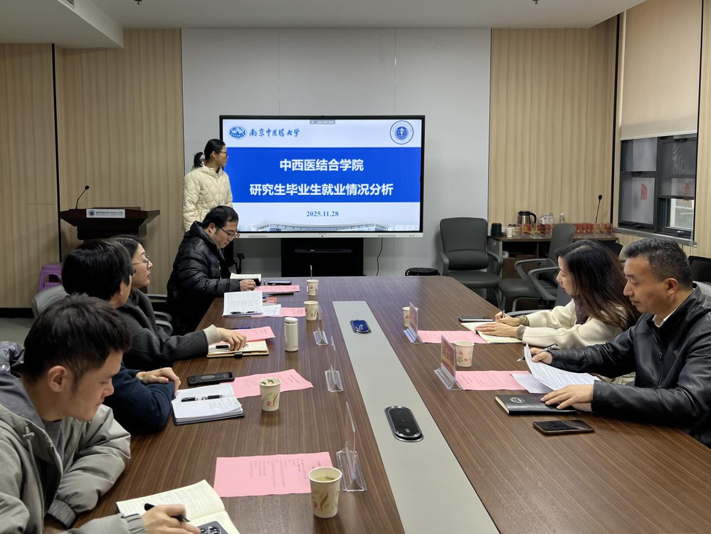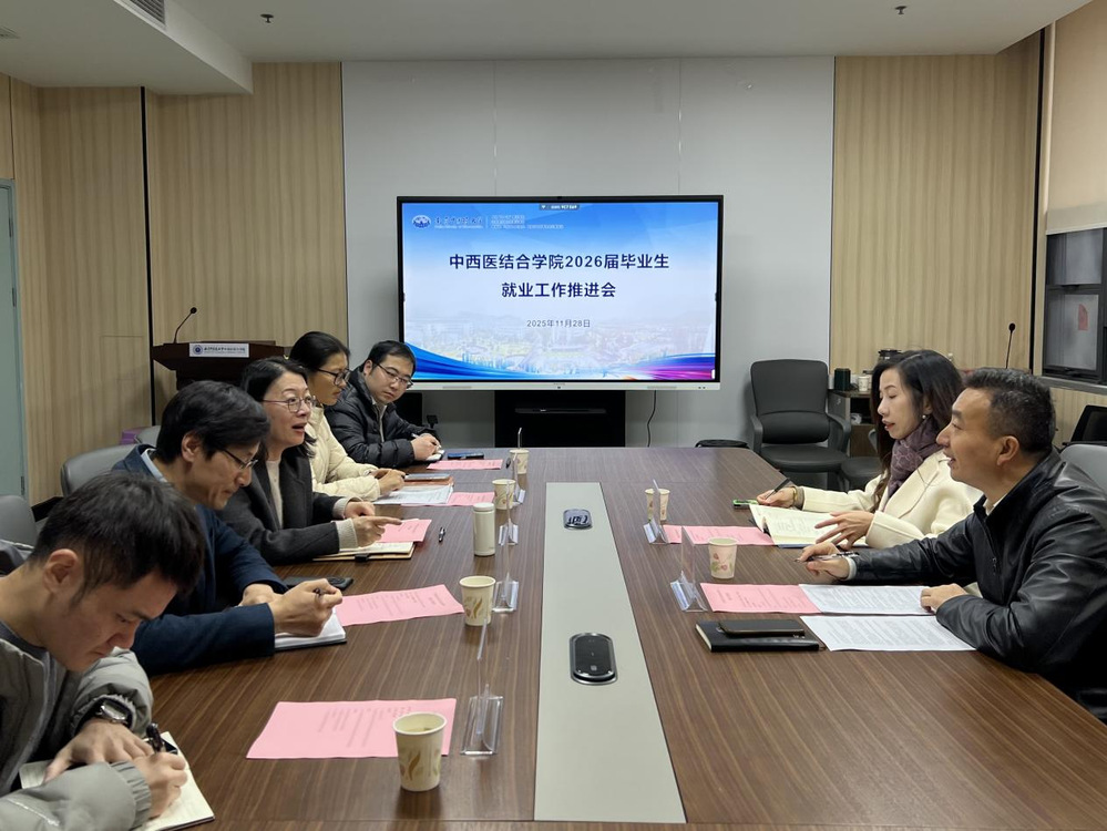 11月28日,中西医结合学院于丰盛健康楼116会议室举办2026届毕业生就业工作推进会。学生工作处副处长刘云龙,党委研究生工作部副部长沈佳,中西医结合学院党总支书记蒋燕,院长贾立军,院长助理章轶立出席了会议。中西医结合学院学工办副主任徐梓凌,研究生工作负责人孙文渊,本科毕业班班主任代表黄花英,研究生毕业班班主任代表朱丹阳参加了会议。会议由蒋燕主持。