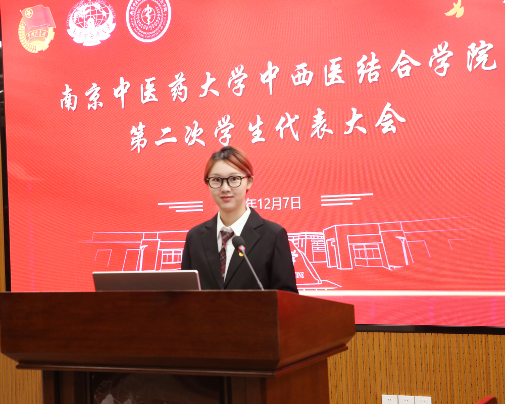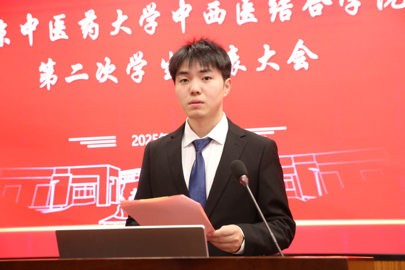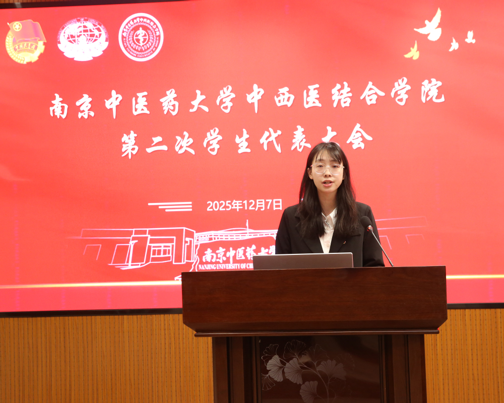2025年12月7日,南京中医药大学中西医结合学院第二次学生代表大会在仙林校区图书馆102敬文报告厅召开。共青团南京中医药大学委员会书记史文川、院党总支书记蒋燕、校学生会主席团成员操瑞颖,各兄弟学院学生会指导老师、学生会代表,以及学院86名正式代表共同参会。会议由院学生会主席李鑫悦、张欣欣共同主持。