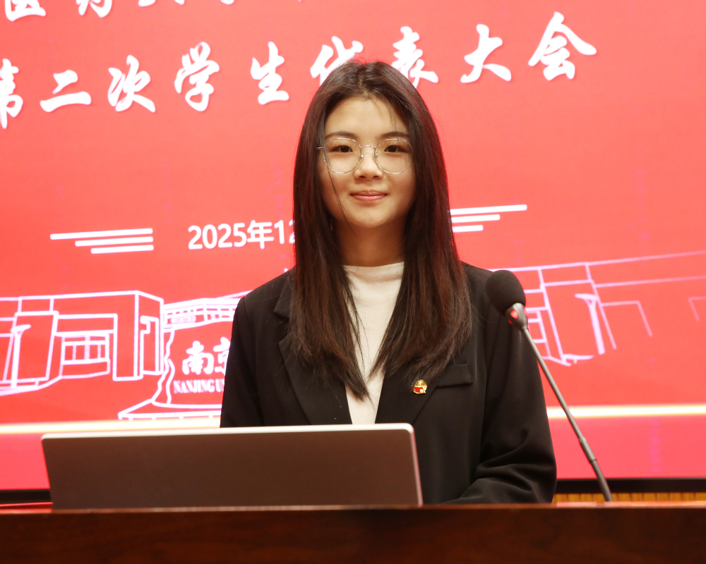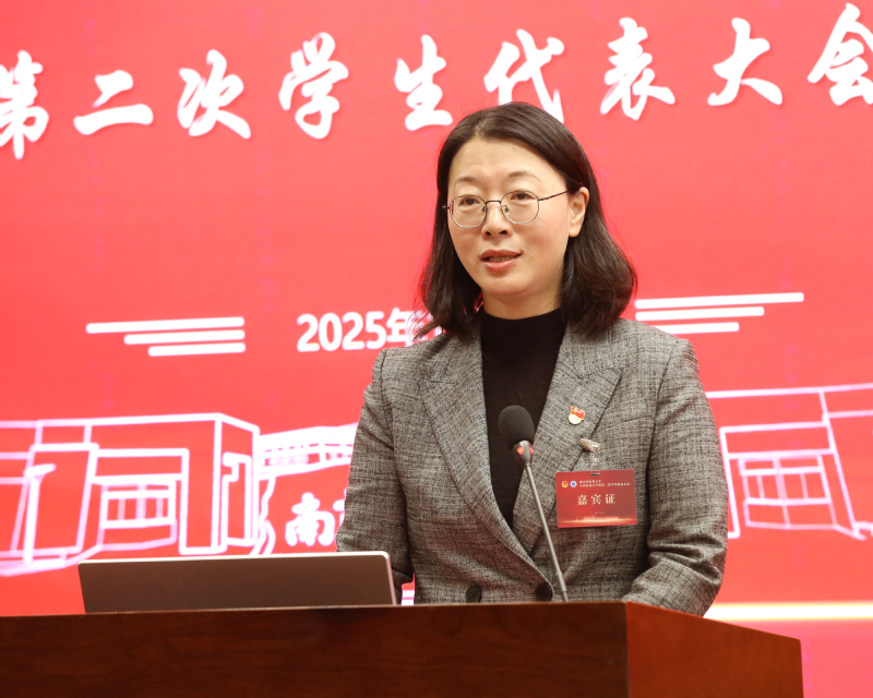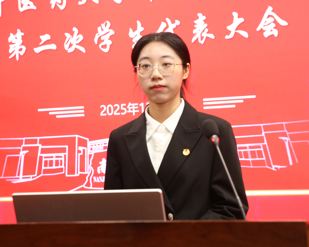 操瑞颖代表校学生会发言,她表达了对学院学生会工作的认可与期待,并希望大家:筑牢思想根基,强化政治引领;深化组织改革,提升服务效能;聚焦成长需求,丰富平台载体。