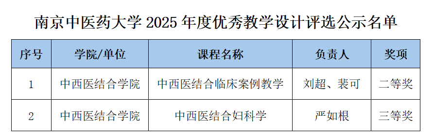 近日,教务处组织的2025年度优秀教学设计评选结果揭晓。经院级推荐、学院交叉投票、校级专家评审三轮环节,我院《中西医结合临床案例教学》《中西医结合妇科学》两门课程分获二、三等奖,为学院课程内涵建设提供实践参考。