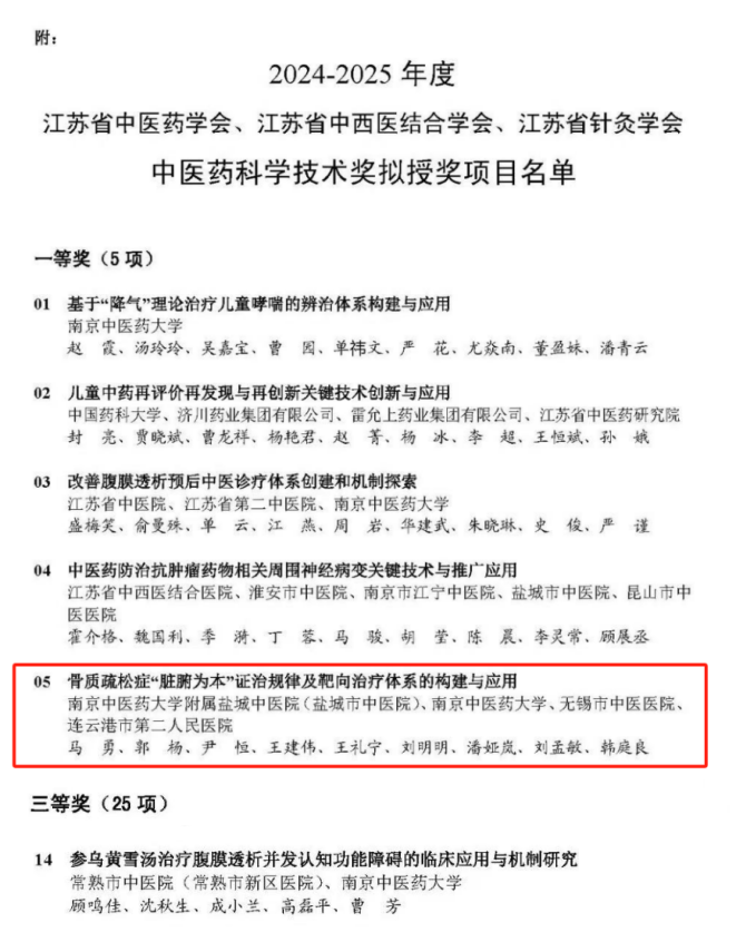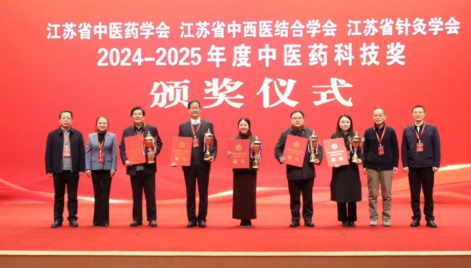 近日,2026江苏省中医药发展、中西医结合学术会议在南京举行,会上颁发了2024-2025年度江苏省中医药学会、中西医结合学会、针灸学会中医药科学技术奖。我院在该奖项评选中取得佳绩,马勇教授主持完成的研究项目荣获一等奖,成小兰副教授参与完成的研究项目荣获三等奖。