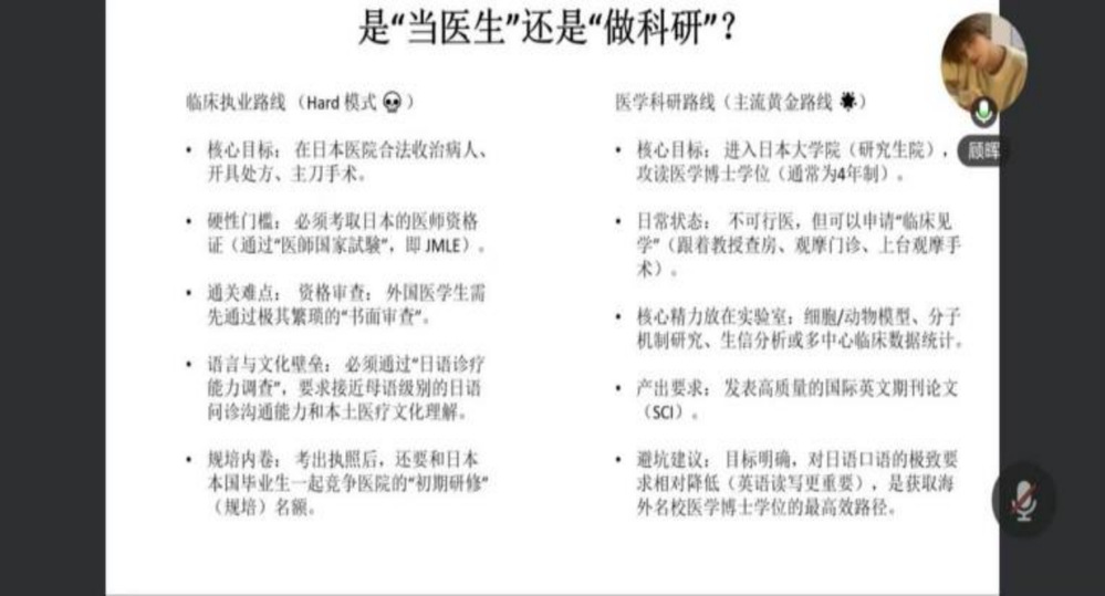 针对出国深造路径,顾晖通过对比中日研究生培养模式的差异,分析了海外升学在缓解时间焦虑、明确职业定位方面的特点,并就经济成本等现实问题进行了客观分析。杜嘉怡引导同学们思考未来理想的职业状态,剖析了国内外教学模式的异同,鼓励大家勇于尝试多元发展路径,在探索中找到最适合自己的深造方向。