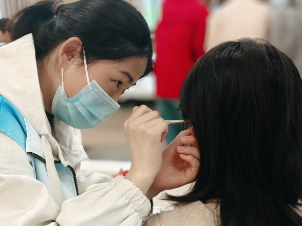 为让师生直观感受中医外治特色,活动设立耳穴埋籽体验区。志愿者们为体验者精准粘贴王不留行籽,指导按压手法与频次,讲解耳穴埋籽在缓解疲劳、改善睡眠、调节脏腑功能中的实用价值。师生们亲身体验后,纷纷为这一“小巧思大作用”的中医技法点赞。